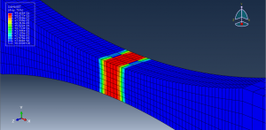 برای بتن از متریال مدل به صورت الاستیک و مدل پلاستیسیته بتن آسیب دیده یا Concrete Damaged Plasticity استفاده شده است. مدل رفتاری بتن بر اساس ترک برداشتگی کششی و خرد شدگی فشاری عمل می کند. در واقع با انجام تست کشش باید مقاومت کششی وارد شده در بخش متریال در محیط نتایج در نمودار تنش کسب گردد. تحلیل به صورت غیر خطی بوده و برای آن از یک استپ جنرال استاتیک به همراه تغییراتی در مدل همگرایی استفاده شده است. در این تحلیل بر هم کنشی وجود نداره و فقط از یک قید کوپلینگ استفاده شده است. شرط مرزی گیردار به یک انتهای قطعه و شرط مرزی جابه جایی به سمت دیگر اختصاص داده شده است. مش بندی باید در ناحیه نازک شدگی ریز بوده و به همین منظور از چند پارتیشن استفاده شده است.