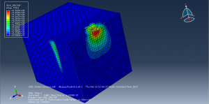 In this tutorial Prediction model of depth of penetration for alumina ceramics under garnet impact in Abaqus has been studied .The target and projectile were modeled as three dimensional parts .The JH-2 constitutive model was proposed to describe the response of ceramic materials to large strain rate. The JH-2 constitutive model requires several material constants to completely describe the response of a particular ceramic material.The dimensions of the target were 1000×۴۰۰×۴۰۰μm3 . The boundary conditions for the target were defined as follows: Nodes impacted by a particle on the top face of the target were set free, while nodes on all the other five exterior faces of the target were fixed. A more refined mesh was used in the vicinity of the impact on the target, while a relatively coarse mesh was applied away from the impact area. The abrasive particle was modeled as a sphere using rigid 3D solid (tetrahedral) elements.You can see a figure of the assembled part at belo