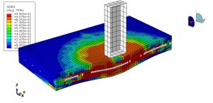 The objective of this investigation is to evaluate the punching shear capacity and failure mechanisms of RC flat slabs reinforced with superelastic Ni–Ti under low-velocity impact loading. Particular attention is given to load–time response, impact force history, energy dissipation, crack patterns, damage evolution, and residual deformation. The study aims to provide insight into the effectiveness of superelastic Ni–Ti reinforcement in mitigating brittle punching failure and enhancing impact resilience of flat slab systems. After the simulation, all results such as stress, strain, tension damage, compression damage, stiffness degradation, and … are available. You can see some figures of the results below