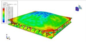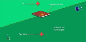 In this simulation, the analysis of super-austenitic stainless steel panels under air blast and underwater explosion in Abaqus has been done. The two steel plates and the sandwich core are modeled as three-dimensional parts. You can see a figure of the assembled parts below